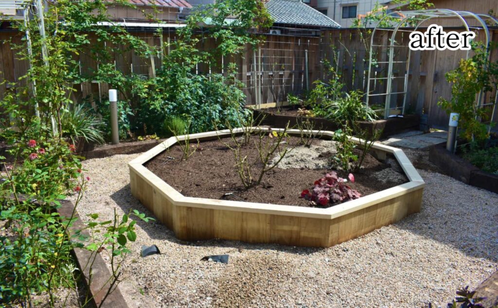 木製のレイズベッドが現代和風の美しい建物に違和感なく溶け込めたと感じています。