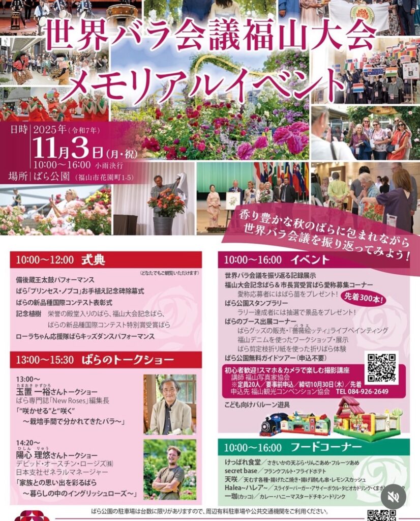 ばら公園で、世界バラ会議福山大会を振り返り、秋ばらを楽しむイベントが開催されます🌟
